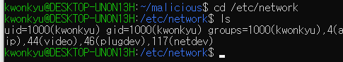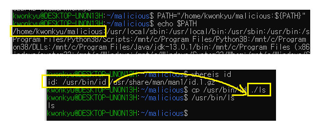 그렇기 때문에 이를 악용할 수 있는 방법 중 하나는 동일한 이름의 다른 바이너리(공격자가 업로드했거나 이미 시스템에 존재하거나)를 PATH 환경변수에서 원래 명령어가 들어있는 디렉토리보다 앞쪽의 디렉토리(위의 예제에서는 /home/kwonkyu/malicious)로 옮겨서 원래 명령어 대신 실행되도록 하는 것이다. 위의 예제에서는 PATH 환경변수 맨 앞에 별도의 디렉토리를 지정한 후 해당 디렉토리 내부에 id 명령어 파일을 복사해서 ls 명령으로 이름을 바꿔두었다. 이때 ls는 "ls --color=auto" 로 alias가 설정되어 있었기 때문에 잠시 해제해두고 실습을 진행했다. 그리고 아무 디렉토리나 가서 어떤 파일들이 있는지 보기 위해 ls 명령어를 입력하면 어떻게 될까?