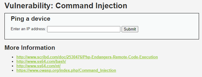 DVWA의 두 번째 실습 대상인 Command Injection이다. 주어진 IP 주소로 ping 명령을 수행하는 시스템이며 이를 이용하여 커맨드 인젝션을 실습해볼 수 있다.