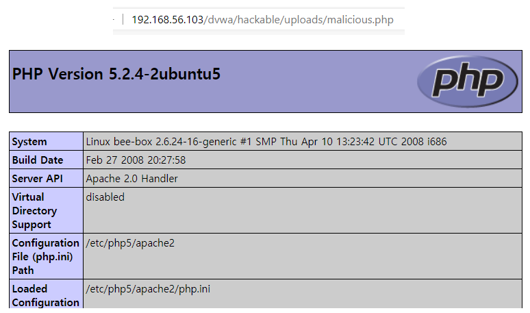 지금은 텍스트 파일이기 때문에 단순히 내용을 출력하고 끝났지만 php 파일이나 자바스크립트 파일이 업로드됐다면 어땠을까? 이 경우 서버 측에서 코드가 실행되기 때문에 다음처럼 서버 정보 노출이나 추가 피해가 발생할 수 있다.