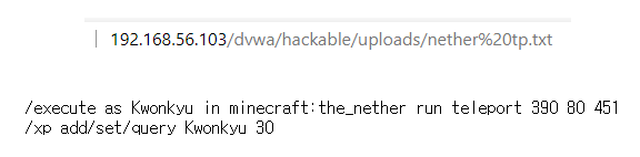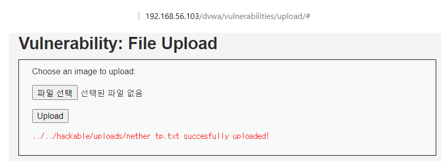 현재 실습 페이지의 주소는 "/dvwa/vulnerabilities/upload/(index.php)"다. 파일이 업로드된 경로를 보면 "../../hackable/uploads/nether tp.txt"기 때문에 파일이 저장된 경로는 "/dvwa/hackable/uploads/nether tp.txt"다. 실제로 이곳으로 이동해보면 다음처럼 업로드된 파일을 읽을 수 있다.