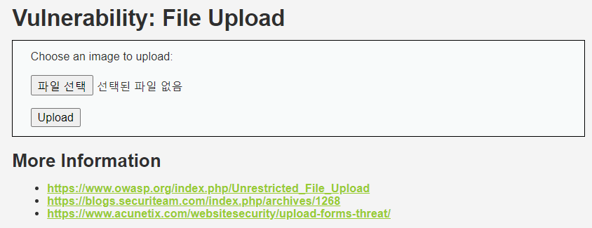DVWA의 다섯 번째 실습 대상인 File Upload다. 선택한 파일을 업로드하는 기능을 가진 폼에 필터링이 제대로 구현되어 있지 않아 악성 파일들이 업로드될 수 있으며 이를 이용해 서버 측의 php 엔진에서 phpinfo() 등 php 코드를 실행하는 것이 목적이다.